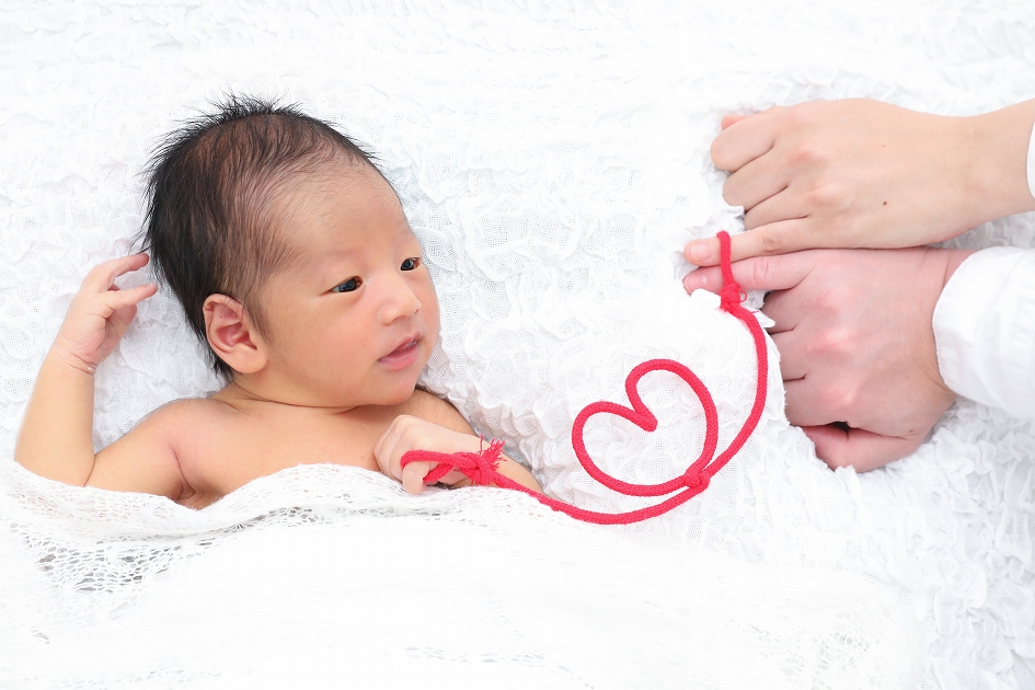 お腹の上の赤い糸の演出はご両親とこの絆の継続性とつながりを象徴しています