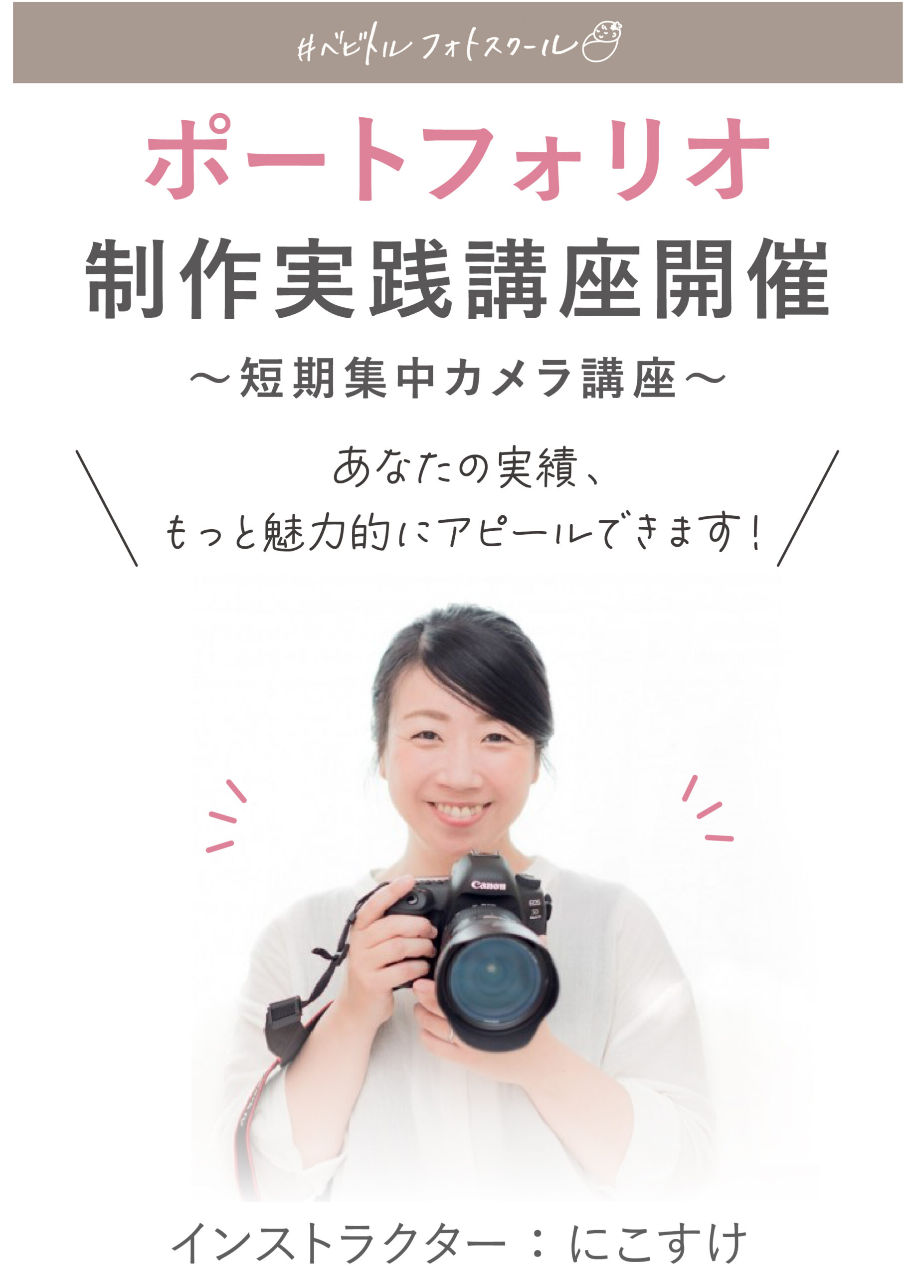 ベビトルでの撮影実績多数、お客様からの評価がとっても高い人気カメラマン「にこすけ」さんから、お客様に選ばれるポートフォリオ作りの秘訣を教えていただきます!リアルな経験に基づいた、にこすけさんの講座は必見!
